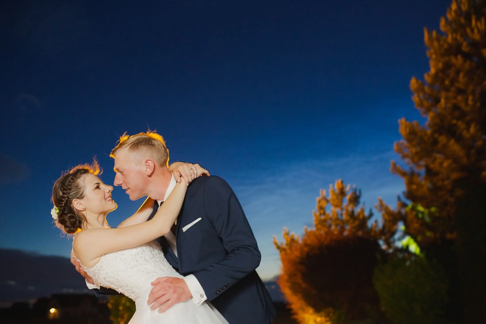Kasia i Dominik na tle nocnego nieba na przeciwko wejścia na salę weselną Pod Jemiołą w Ćwiklicach. Uważny obserwator zauważy jak ich włosy płoną. Myślę, że to miłość ich tak rozgrzewa. To zdjęcie opisuje ich serca - gorące i pełne nadziei na dobre, święte małżeństwo. Zacznijmy jednak od przygotowań.
